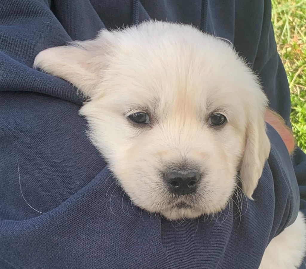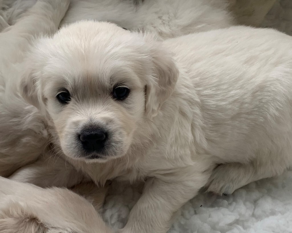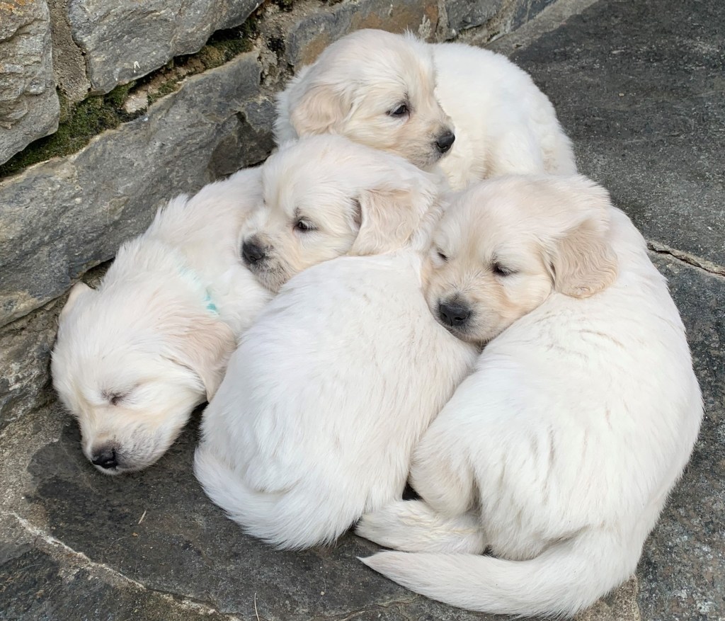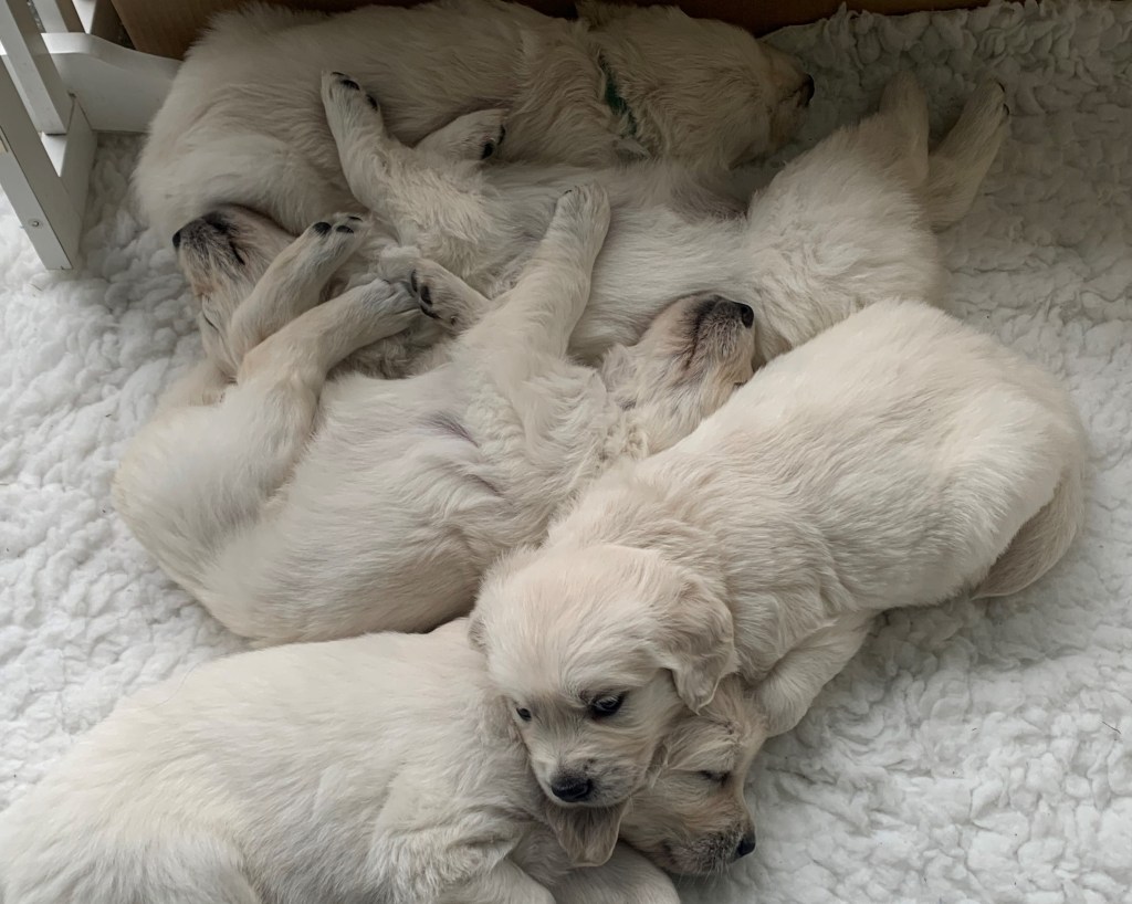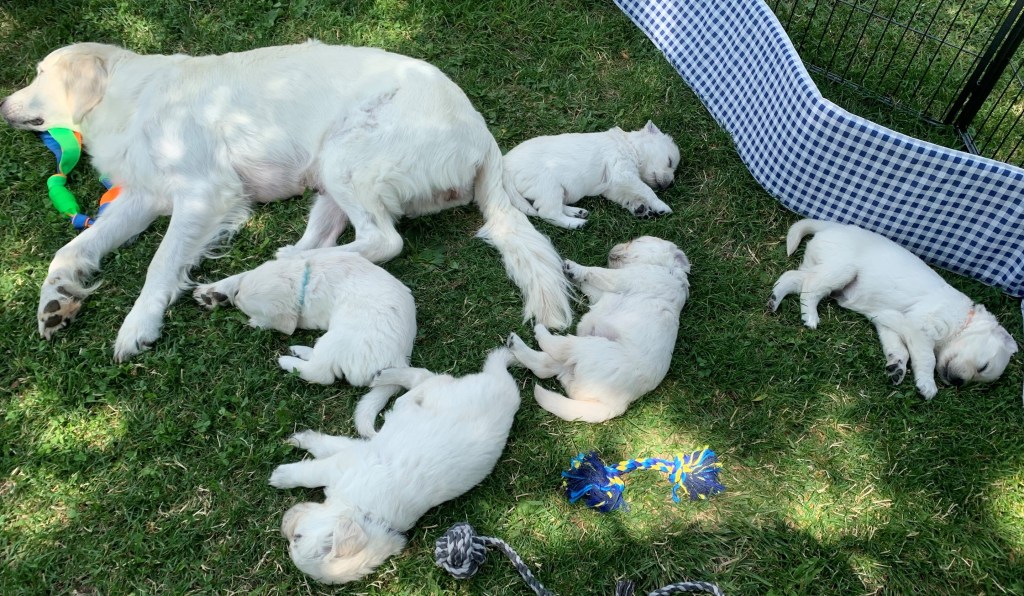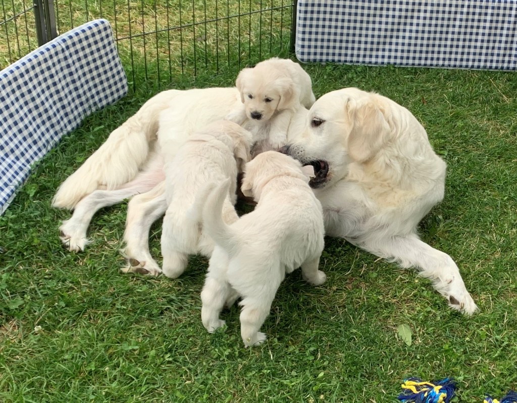 Die Welpen sind heute fünf Wochen alt. Sie sind fast den ganzen Tag draussen und verbringen viel Zeit mit Spielen und Laufen. Sie bewegen sich nun viel sicherer auf der Wiese. Sie rennen vergnügt herum und freuen sich über neue Spielzeuge und über Besuche. Auch Kajsa spielt gerne mit. Manchmal weiss sie aber nicht recht, ob sie spielen darf oder ob sie die Kleinen trinken lassen soll. Nach einer Aktivitätsphase liegen die Welpen plötzlich ab und kuscheln sich gerne aneinander, vor allem wenn es etwas kälter ist.