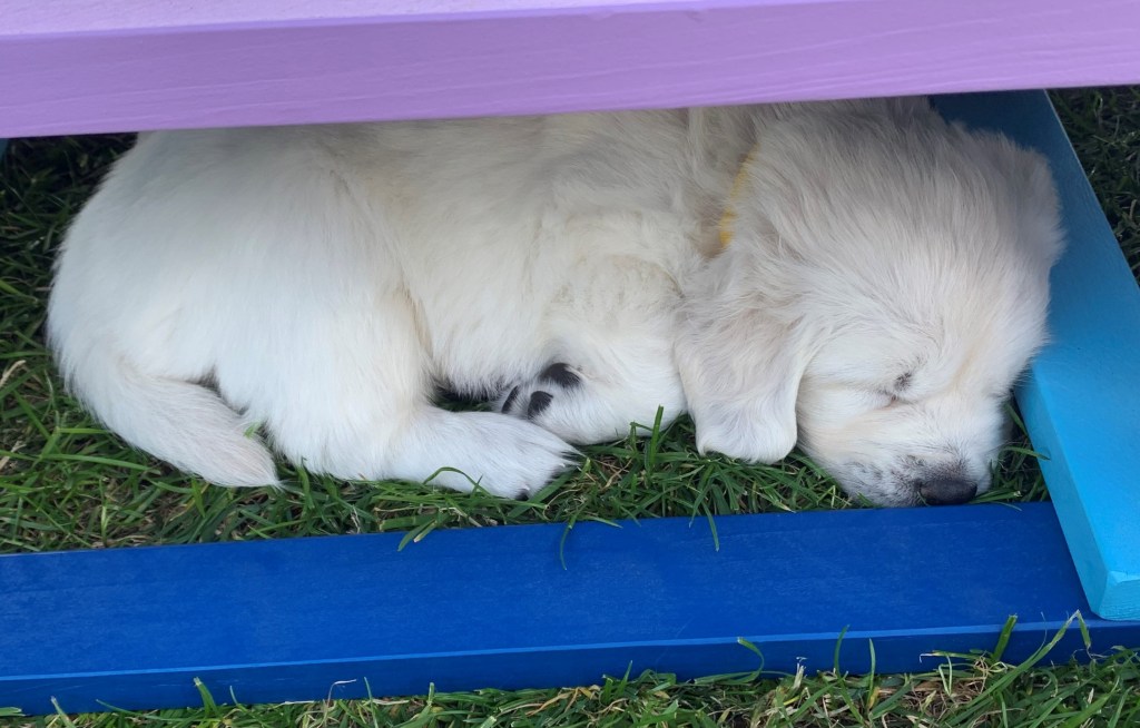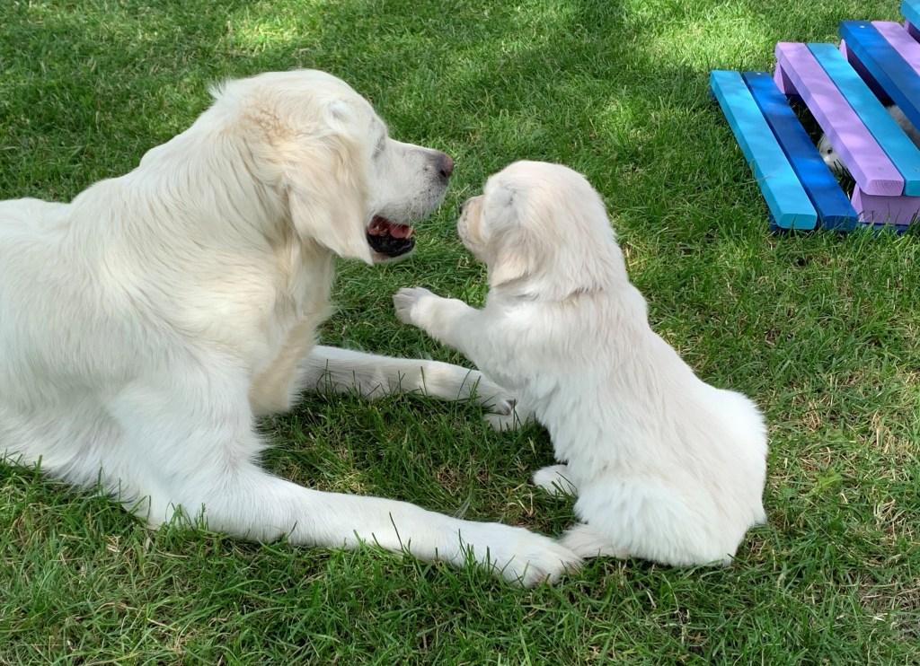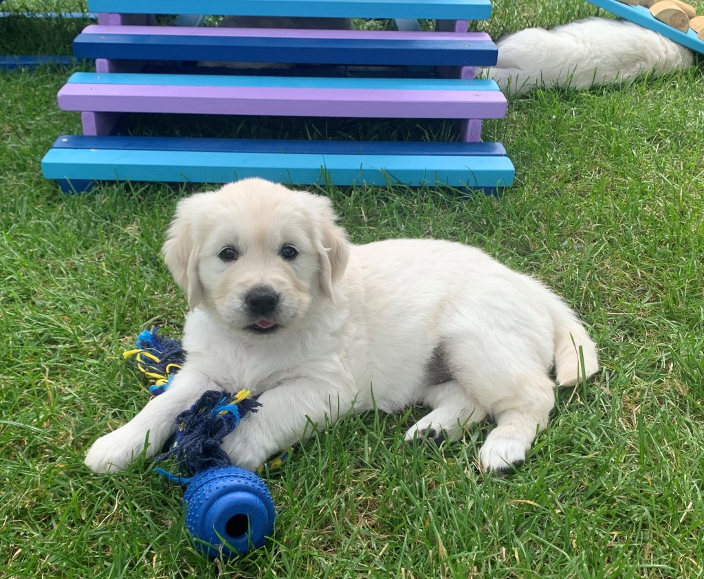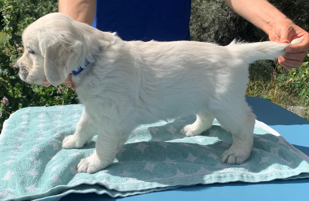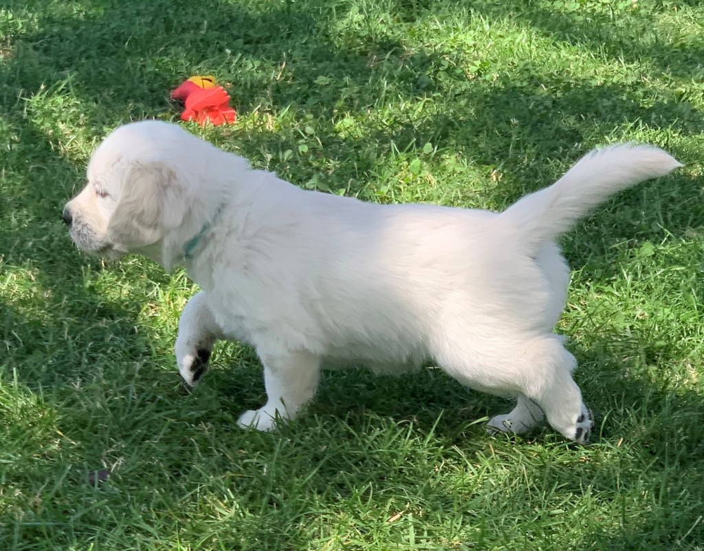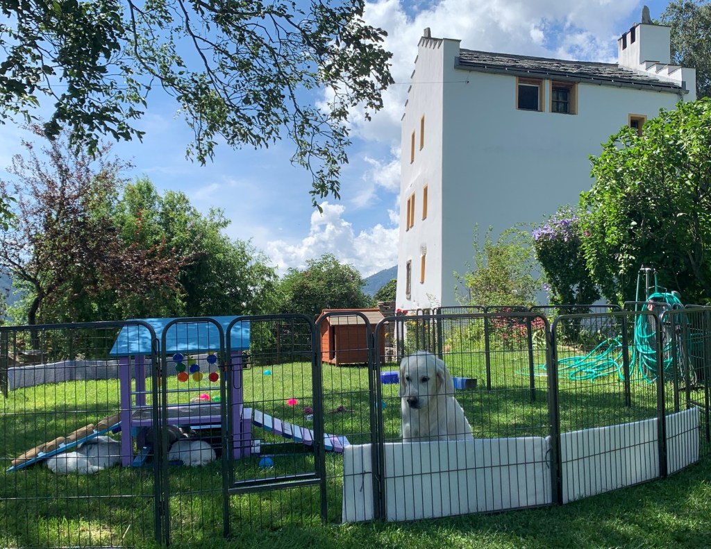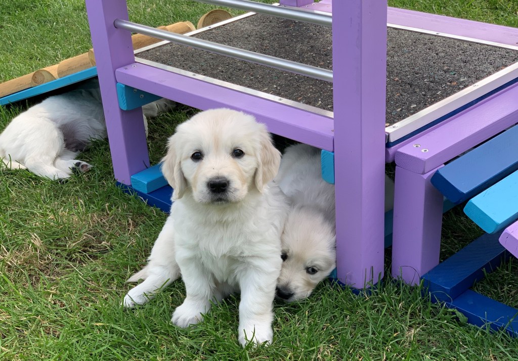 In der 6. Woche konnten die Welpen erstmals den grossen Auslauf auf der Wiese benutzen. Dort haben sie viel Platz und verschiedene Spielmöglichkeiten: ein schönes Spielgerät zum Klettern und Ausruhen, eine Hundehütte, zwei grosse blaue Muscheln (mit Bällen oder Wasser gefüllt), ein Hundesofa zum Spielen und vieles mehr. Kajsa kommt nun auch auf ihre Rechnung: Sie spielt gerne mit den Welpen oder sie nimmt ein neues interessantes Spielzeug für sich und rennt damit um das Gehege herum.